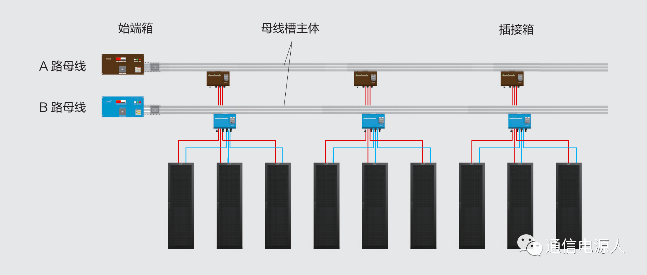 A/B路2N配置(藍 /棕),每條母線既給本列機柜供電,也需通過橫向橋架跨天窗給對列機柜供電(請關注公眾號:通信電源人)。